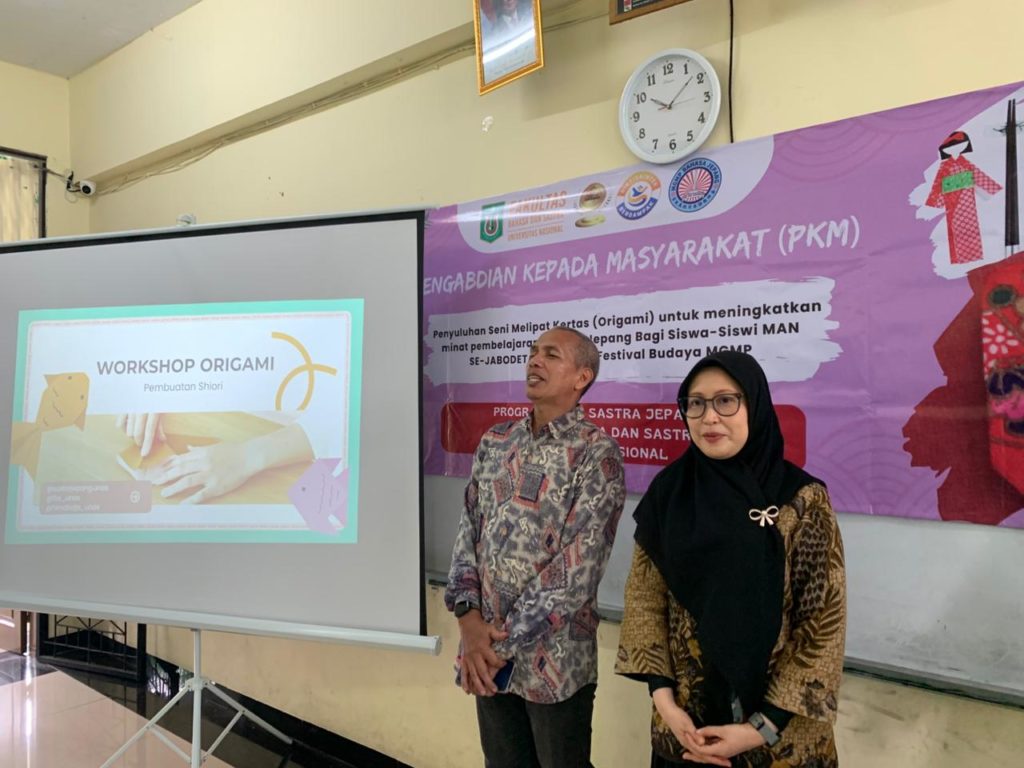 Agenda pertama berfokus pada kegiatan penyuluhan interaktif bertajuk “Penyuluhan Seni Melipat Kertas (Origami) untuk meningkatkan minat pembelajaran bahasa Jepang bagi Siswa-Siswa MAN Se-Jabodetabek dalam Festival Budaya MGMP.”