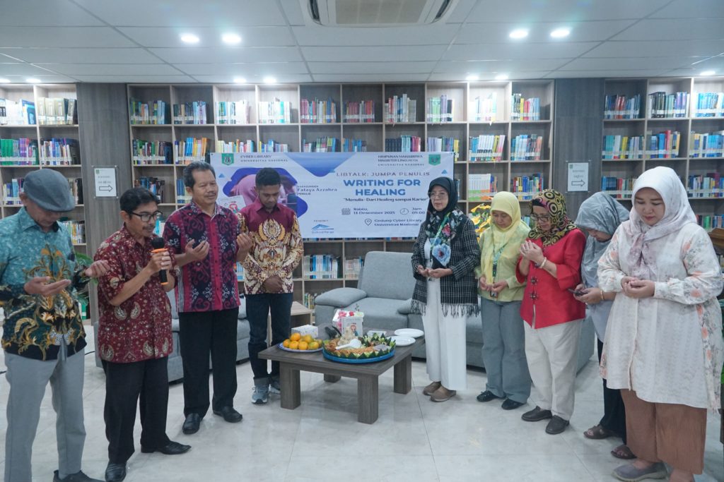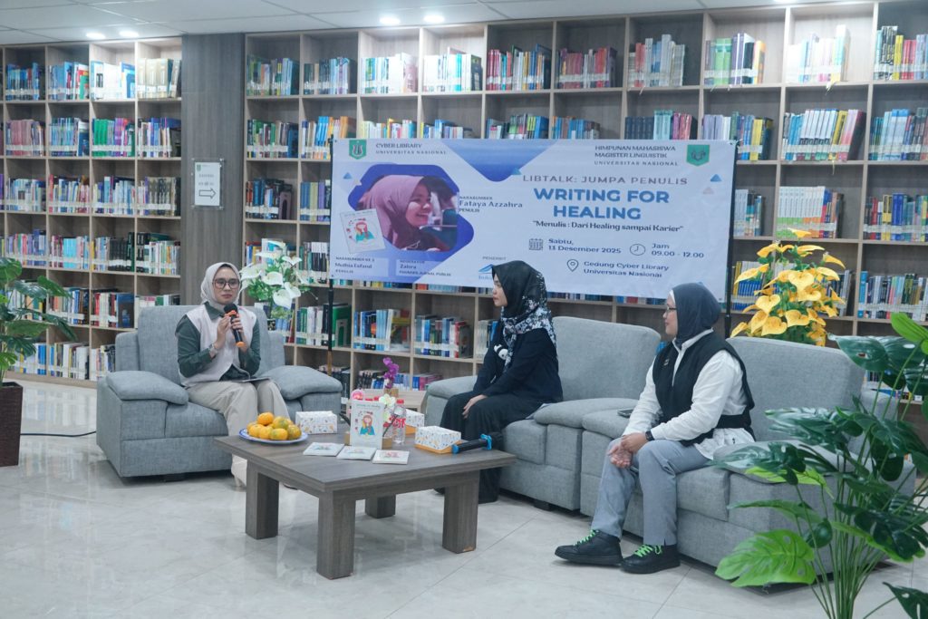 Jakarta (UNAS) — Cyber Library Universitas Nasional bekerja sama dengan Himpunan Mahasiswa Magister Linguistik Universitas Nasional menyelenggarakan kegiatan Libtalk: Jumpa Penulis dengan tema “Writing for Healing: Menulis, dari Healing sampai Karier” pada Sabtu, 13 Desember 2025, bertempat di Gedung Cyber Library Universitas Nasional. Kegiatan ini berlangsung mulai pukul 09.00 hingga 12.00 WIB dan diikuti oleh mahasiswa serta sivitas akademika Universitas Nasional.