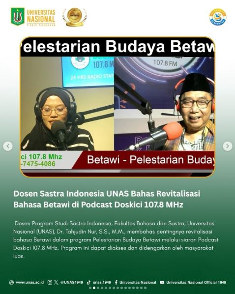 Jakarta (UNAS) – Dosen Program Studi Linguistik dan Bahasa Korea, Fakultas Bahasa dan Sastra (FBS) Universitas Nasional (UNAS), Dr. Tajuddin Nur, S.S., M.M., menjadi narasumber dalam siaran Podcast Doskici 107.8 MHz yang mengangkat tema Pelestarian Budaya Betawi, khususnya terkait revitalisasi bahasa Betawi.