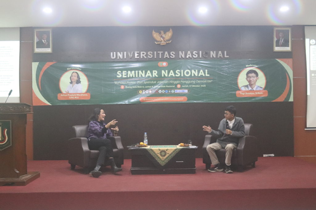 Jakarta (UNAS) – Fakultas Bahasa dan Sastra (FBS) Universitas Nasional kembali menyelenggarakan kegiatan akademik inspiratif melalui Seminar Nasional bertajuk “Bahasa Protes: Dari Spanduk Jalanan Hingga Panggung Demokrasi” pada Jumat, 17 Oktober 2025, bertempat di Aula Blok A Lantai 4 UNAS.