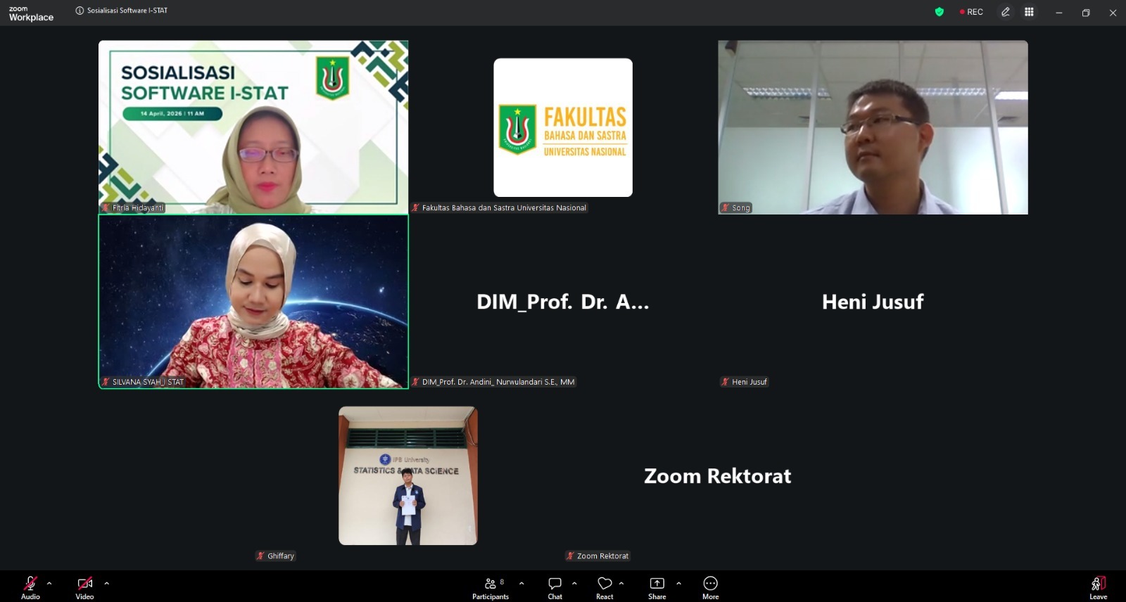 Fakultas Bahasa dan Sastra (FBS) Universitas Nasional turut berpartisipasi dalam kegiatan Sosialisasi Software I-STAT yang diselenggarakan secara daring melalui platform Zoom pada 14 April 2026. Kegiatan ini dihadiri oleh para dosen di lingkungan FBS UNAS sebagai bagian dari upaya peningkatan kapasitas akademik, khususnya dalam pemanfaatan teknologi pendukung analisis data.
