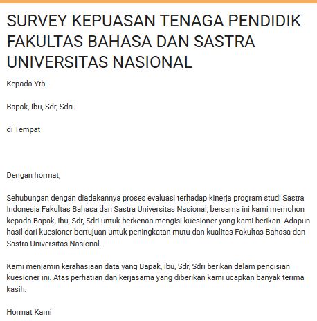 Fakultas Bahasa dan Sastra Universitas Nasional secara berkelanjutan berkomitmen untuk meningkatkan mutu akademik, layanan, serta tata kelola fakultas. Salah satu upaya yang dilakukan adalah melalui pelaksanaan kuesioner yang ditujukan kepada mahasiswa, dosen, tenaga kependidikan, alumni, maupun pengguna lulusan.
