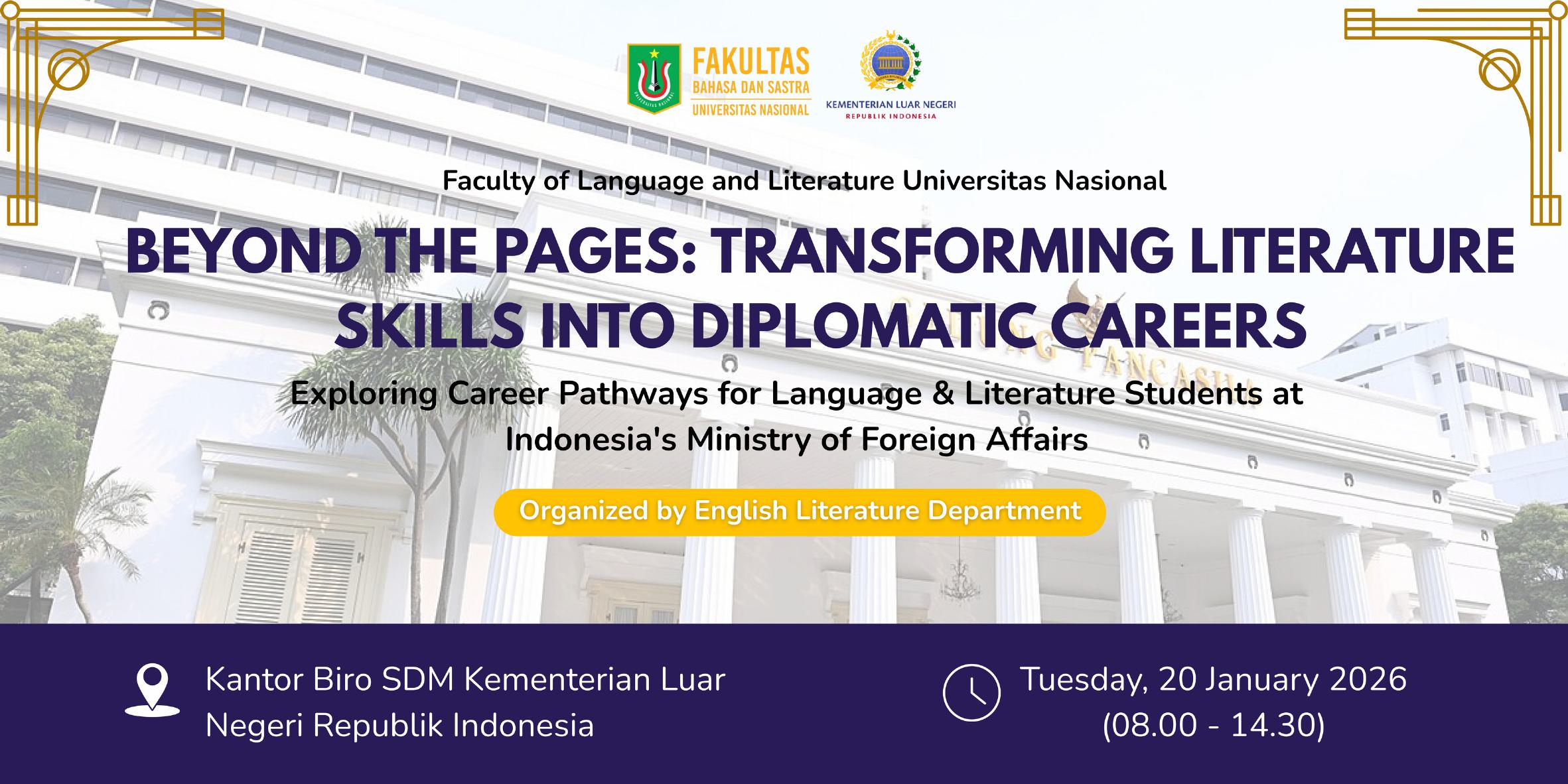 Fakultas Bahasa dan Sastra Universitas Nasional melalui Program Studi Sastra Inggris menyelenggarakan kegiatan bertajuk “Beyond the Pages: Transforming Literature Skills into Diplomatic Careers”, sebuah program pengembangan wawasan karier yang dirancang khusus bagi mahasiswa bahasa dan sastra.
