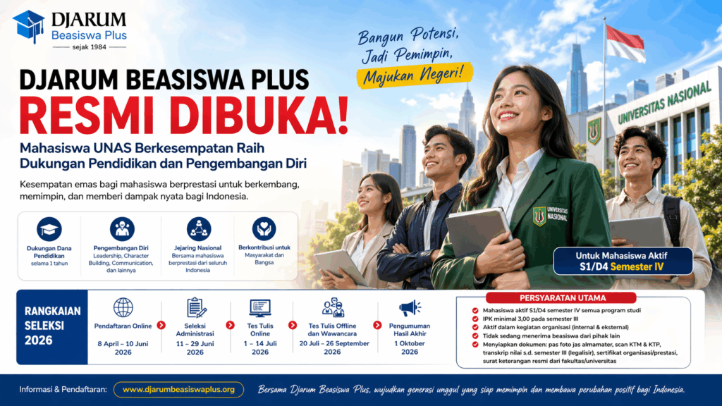 Jakarta (Humas UNAS) – Kabar menggembirakan datang bagi mahasiswa/i Universitas Nasional (UNAS). Program Djarum Foundation kembali membuka pendaftaran Djarum Beasiswa Plus tahun akademik 2026/2027. Beasiswa ini ditujukan bagi mahasiswa berprestasi yang tidak hanya unggul secara akademik, tetapi juga aktif dalam kegiatan organisasi dan memiliki jiwa kepemimpinan.