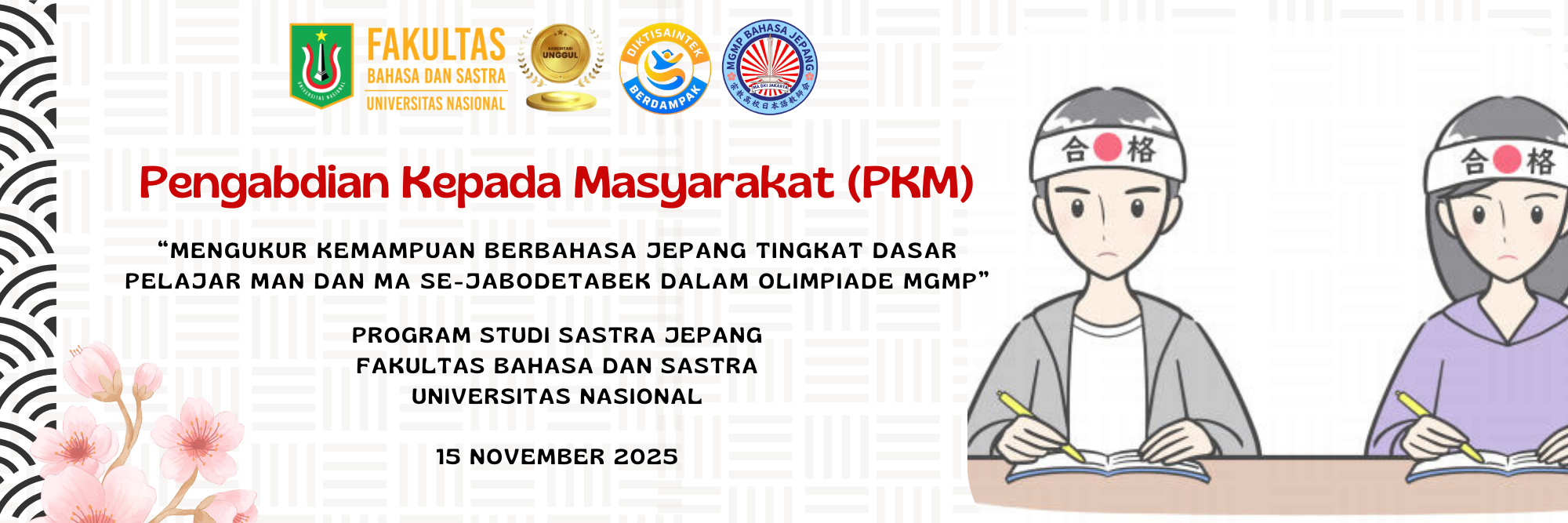 Jakarta (UNAS) – Program Studi Sastra Jepang, Fakultas Bahasa dan Sastra, Universitas Nasional akan melaksanakan kegiatan Pengabdian Kepada Masyarakat (PKM) dengan tema “Mengukur Kemampuan Berbahasa Jepang Tingkat Dasar Pelajar MAN dan MA se-Jabodetabek dalam Olimpiade MGMP.”