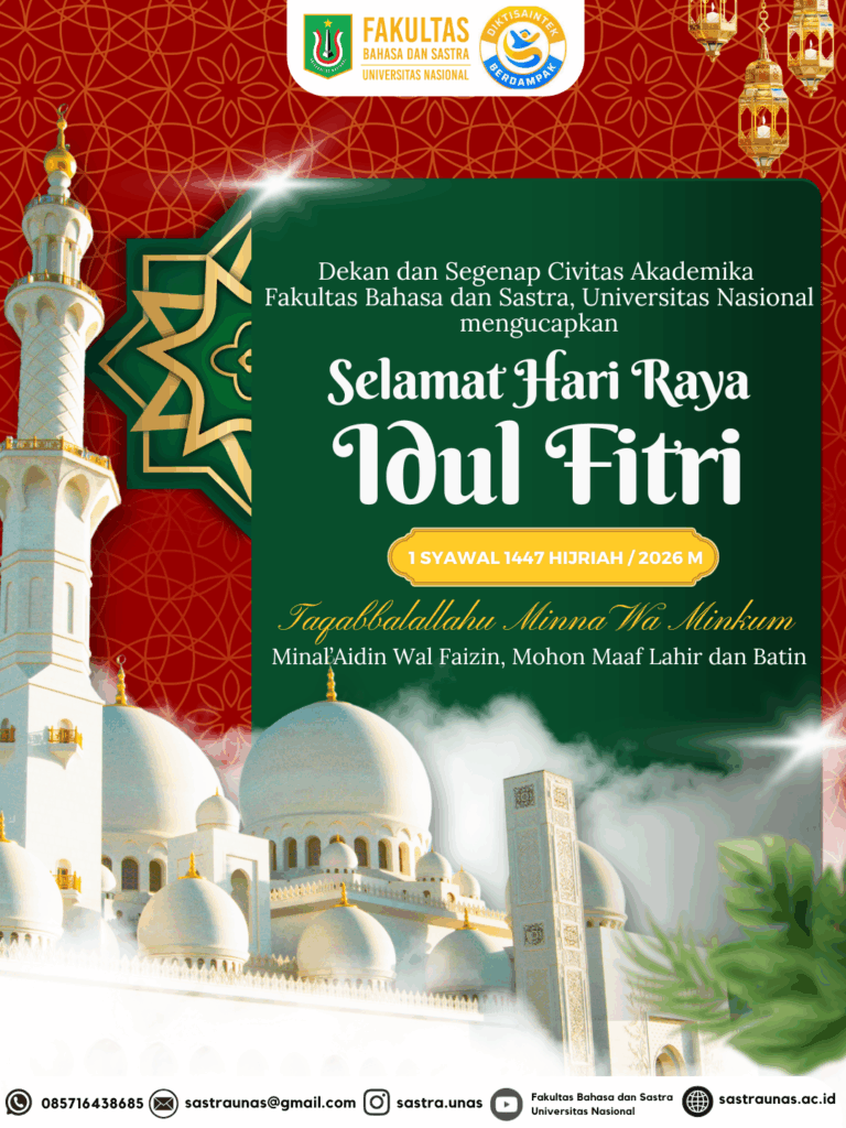 Fakultas Bahasa dan Sastra Universitas Nasional dengan penuh suka cita mengucapkan Selamat Hari Raya Idul Fitri 1 Syawal 1447 Hijriah kepada seluruh civitas akademika, mahasiswa, tenaga kependidikan, serta mitra kerja.