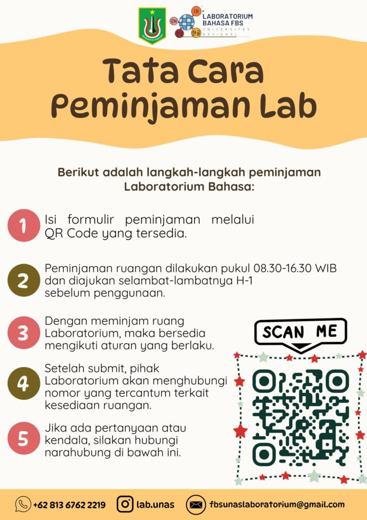 Dalam rangka meningkatkan pelayanan serta tertib administrasi penggunaan fasilitas, Laboratorium Bahasa Fakultas Bahasa dan Sastra Universitas Nasional menetapkan tata cara peminjaman ruang laboratorium bagi seluruh civitas akademika.